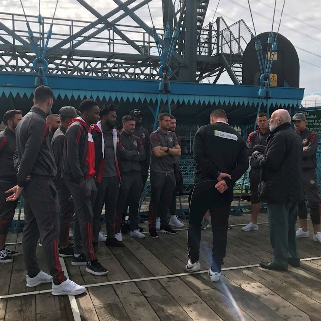 The players listen to David Hando as he explains the link between Newport County AFC and the Newport Transporter Bridge.