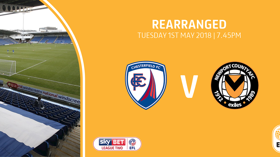 The rearranged match between Chesterfield FC and Newport County AFC will now take place on Tuesday 1st May 2018; 7.45pm kick off.