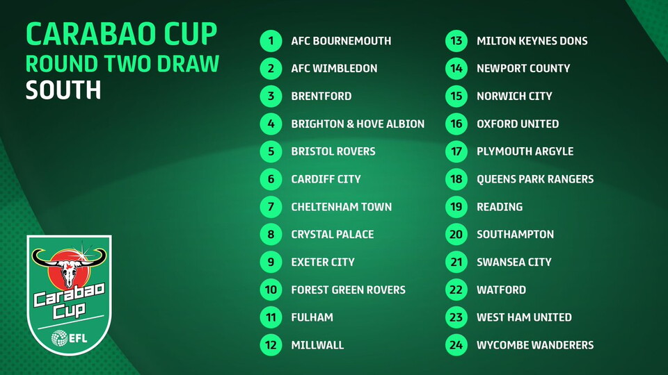Newport County AFC join 23 other teams in the Southern section of the draw with Carabao Cup second round trips to West Ham, Bournemouth, Southampton, Cardiff and Swansea all possible.