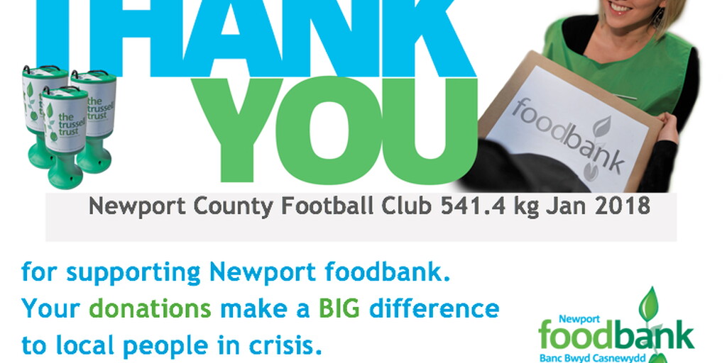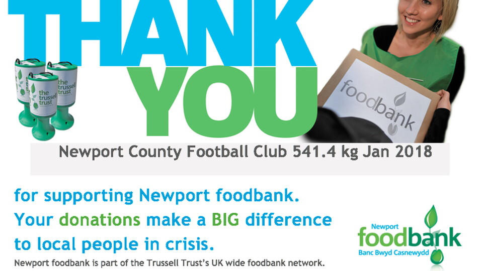 Newport County AFC are delighted to announce that throughout January at both the Morecambe home "Tin Pound a Ticket" match and a separate visit to the Stow Park Church Centre Foodbank, 541.4 kg of food was raised and has been donated to people in need all over Newport.