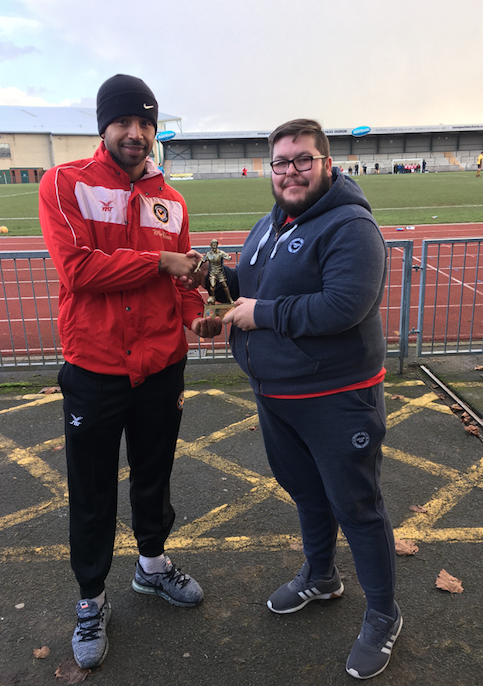 Joss pictured here receiving his award from Rob Taylor, DSA Matchday Volunteer and member as well as part of the Amber Army, was chosen in Rob’s words because he’s “been outstanding this month …”.