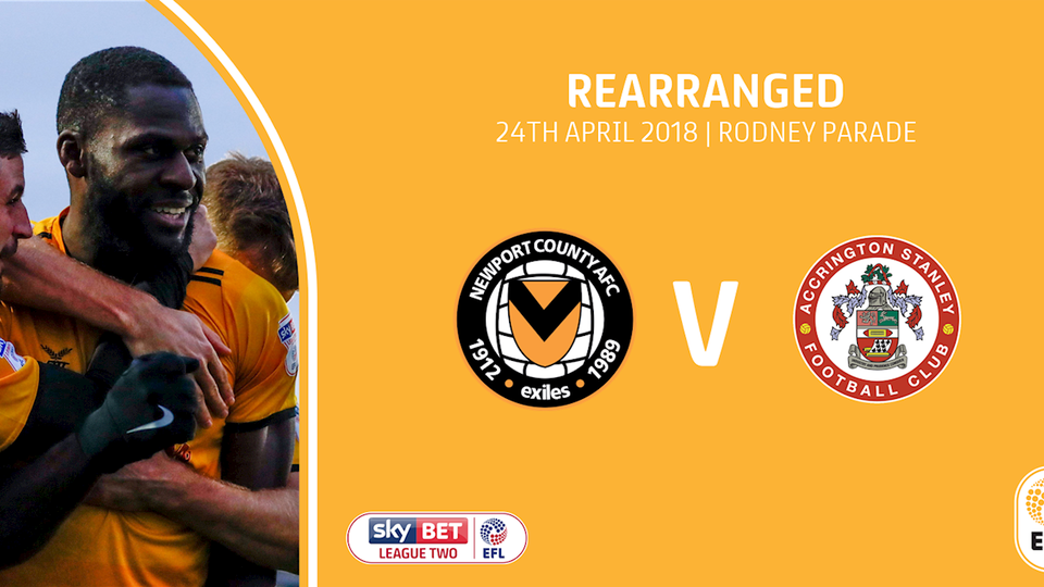 The rearranged match between Newport County AFC and Accrington Stanley will now take place on Tuesday 24th April 2018; 7.45pm kick off.