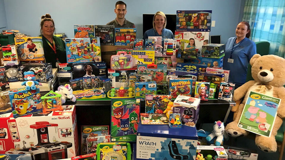 Jan Scourfield, who works in the playrooms at the Royal Gwent Hospital said: “What a fantastic donation to walk in on this morning! I’d like to thank Mickey Demetriou for the incredible effort he’s made to provide us with so many toys. I will split up the toys so all the paediatric departments have a share. I know they will be gratefully received and well used!”