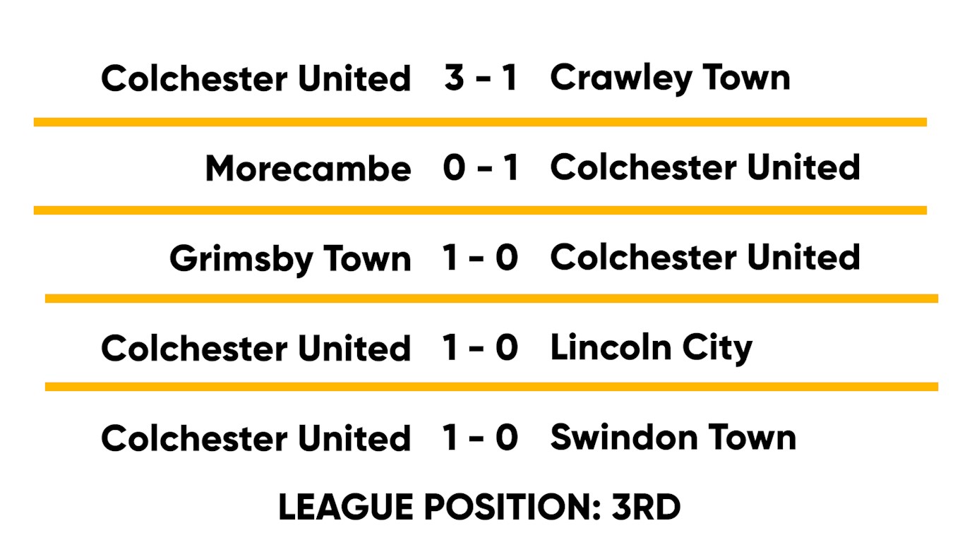 Since then, the Essex outfit have been involved in four successive matches that ended 1-0. Courtney Senior’s first-half strike gave them an away success at Morecambe, while they were the on the wrong side of that scoreline in the next game when Wes Thomas’ goal continued Grimsby Town’s inspired form.