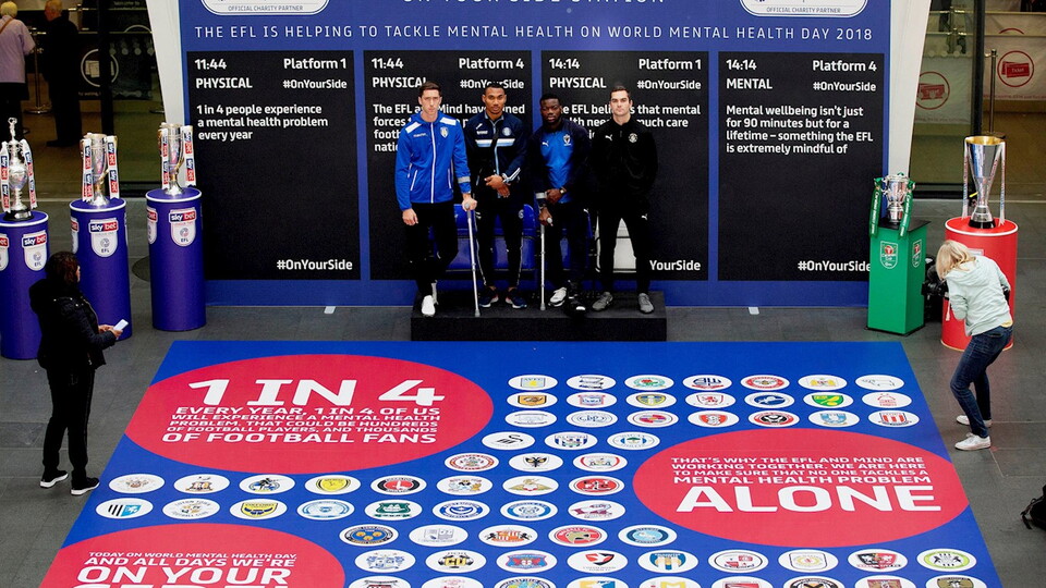Highlighting the statistic that 1 in 4 people will experience a mental health problem each year, James Shea (Luton Town), Deji Oshilaja (AFC Wimbledon), Luke Prosser (Colchester Utd) and Darius Charles (Wycombe Wanderers) surprised football fans and commuters by taking centre stage at a special temporary installation on the King’s Cross station concourse, on behalf of the English Football League (EFL) and its charity partner, the mental health charity Mind.