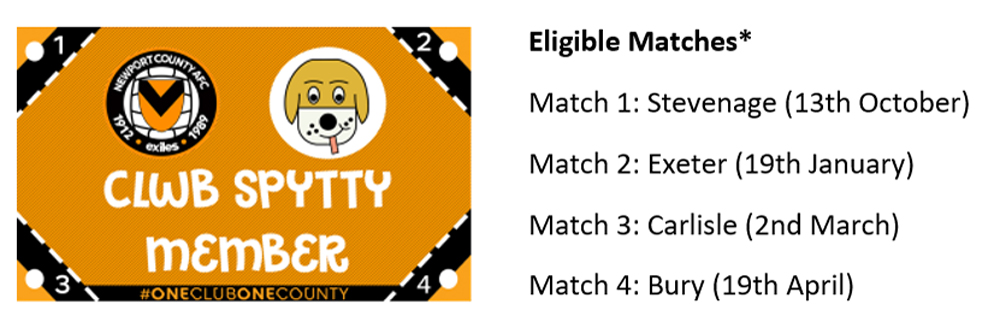 The Clwb Spytty offer is available at FOUR matches this season with the first one 13th October when Newport County AFC face Stevenage FC at Rodney Parade.