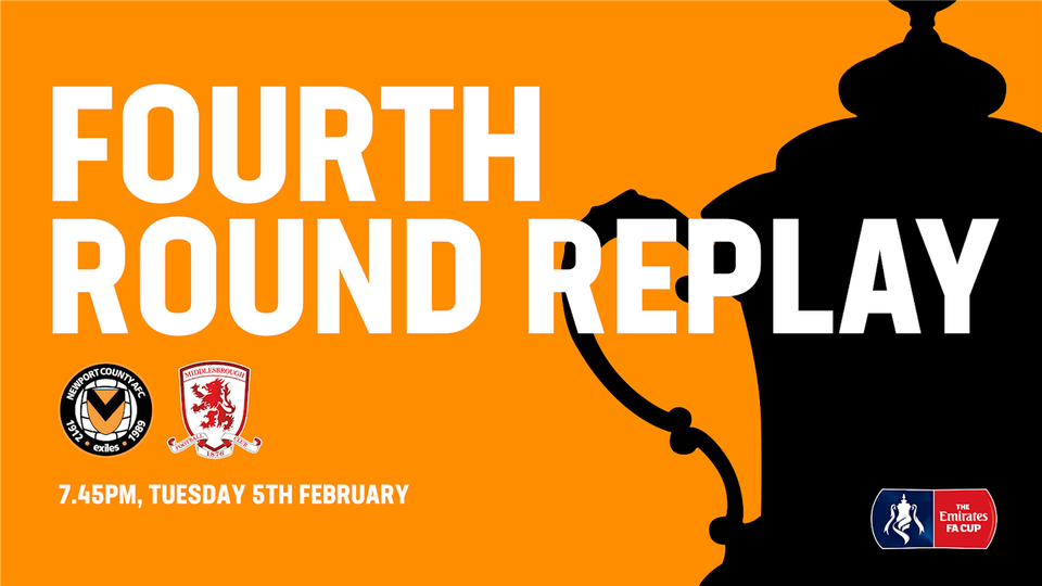 Following Saturday’s dramatic draw at the Riverside, Newport County AFC will play Middlesbrough FC in an Emirates FA Cup Fourth Round replay at Rodney Parade on Tuesday 5th February, kick-off 7.45pm.