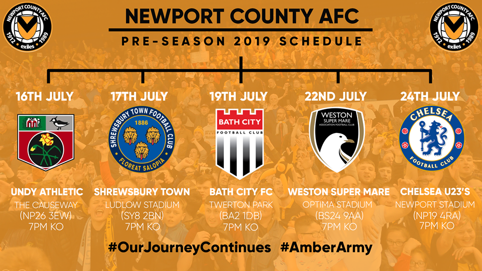 This seasons pre-season friendly schedule begins with a familiar trip to Undy AFC, before the Exiles travel to Shrewsbury, Bath City and Weston Super Mare before facing Chelsea Under-23's at Newport Stadium.