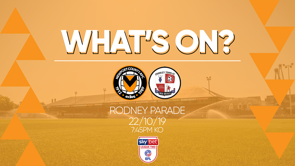 This Tuesday 22nd October, Newport County AFC take on Sky Bet League Two side Crawley Town at Rodney Parade. Find out everything that is happening this matchday below!