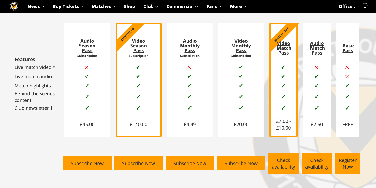 Once your account has been created, it will take you to the same screen as step 3. Scroll down the page and you will see a section called “match passes”. Click the “subscribe now” button on the match you have received a code for.