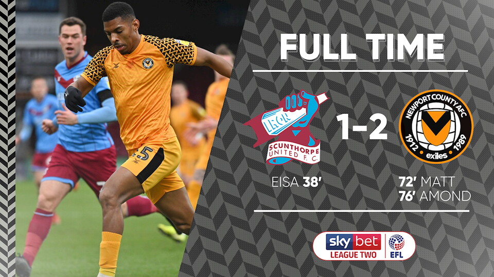 Newport County AFC scored twice late on to steal victory away from 10-man Scunthorpe United at a cold and windy Sands Venue Stadium for their first SkyBet League Two win in 11 games.