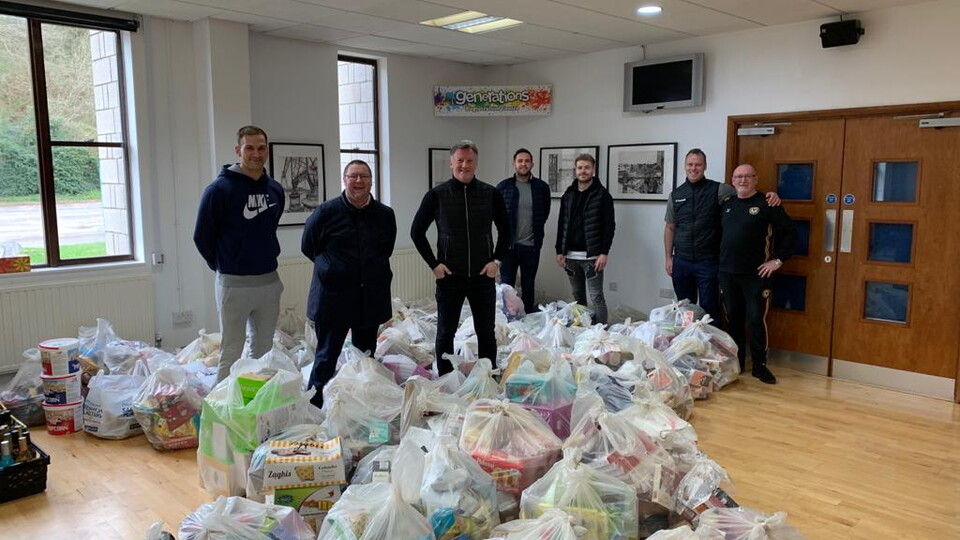 Chairman Gavin Foxall along with, first-team Manager Michael Flynn, Assistant Manager Wayne Hatswell, kitman Neil Leek and first-team players Matty Dolan, Ashley Baker and Mickey Demetriou all helped to deliver the products from TK Maxx to the food bank in Newport.