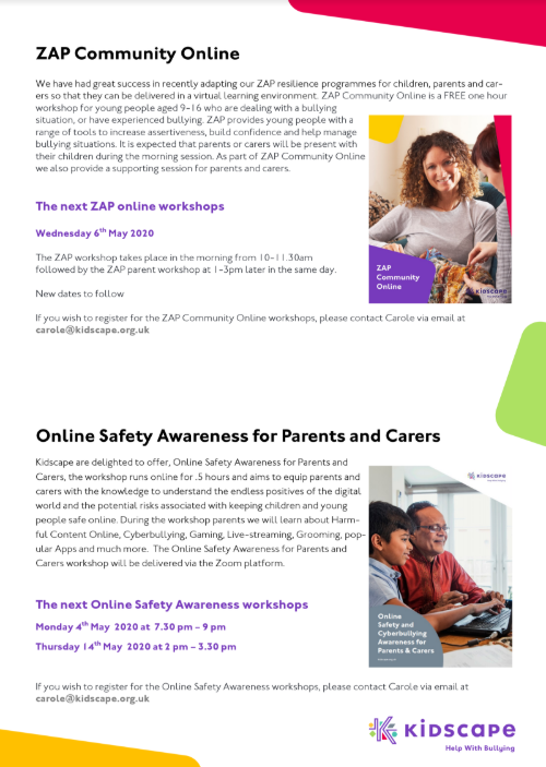 The ZAP Community Online workshop will help to build confidence and assertiveness for children dealing with a bullying situation, while the Online Safety and Awareness workshop for parents will give advice and guidance in relation to the risks children face when using the internet, how parents can protect their children online and also some useful resources to use.