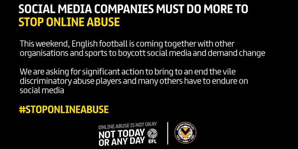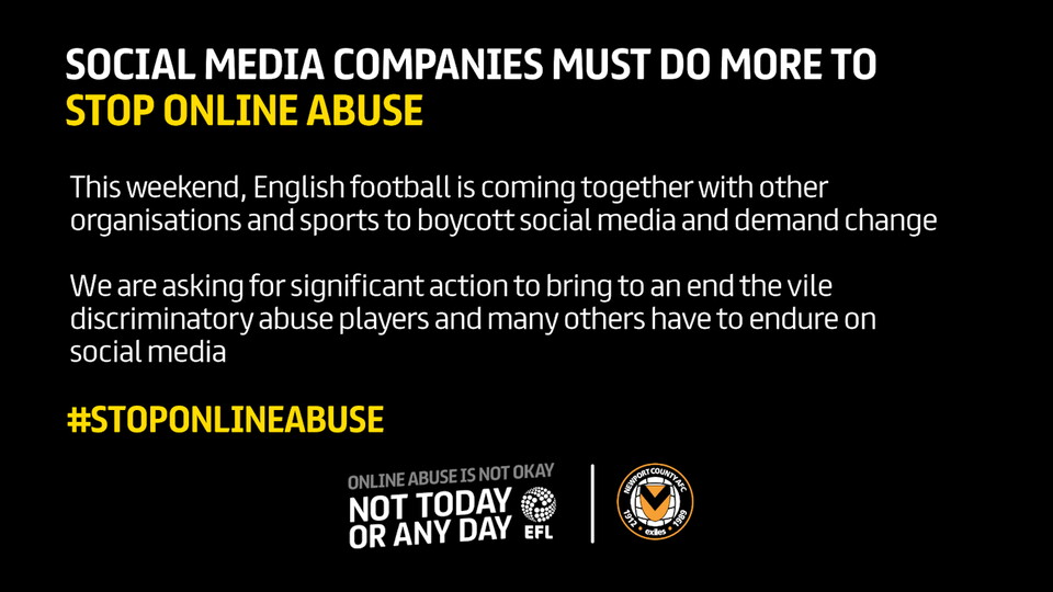 Newport County AFC will join the EFL, English football and wider sport in switching off our Facebook, Twitter and Instagram accounts, from 3pm Friday 30 April to 11.59pm on Monday 3 May.