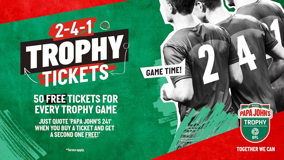 Interested? Well, Papa John’s are giving away 50 FREE tickets to every Papa John’s Trophy game. Simply quote ‘Papa John’s 241’ when ordering your match ticket and get a second one FREE, on them!