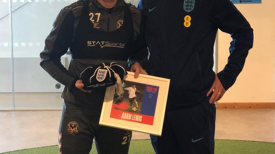 County defender Adam Lewis has been presented with one of his England youth caps after representing his country at four levels across youth age groups.