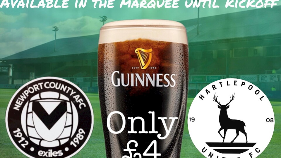 Ahead of Friday’s Sky Bet League Two fixture against Hartlepool United F.C. Exiles supporters can take advantage of Friday’s exclusive Guinness offer, with pints of Guinness available for £4 within the Marquee up until kick off.