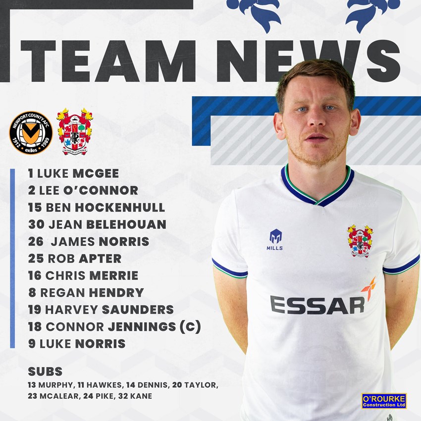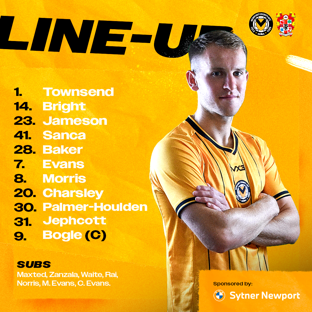 Newport County: Townsend, Bright, Jameson, Baker, Sanca, Evans, Charsley, Morris, Palmer-Houlden, Bogle (C), Jephcott.