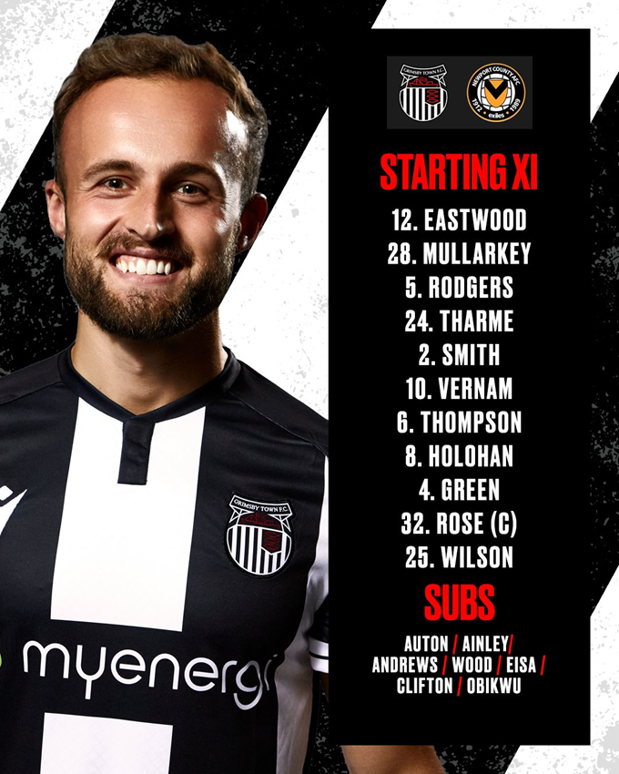 Grimsby Town: Jake Eastwood, Mullarkey, Rodgers, Tharme, Smith, Vernam, Thompson, Holohan, Green, Rose (C), Wilson.