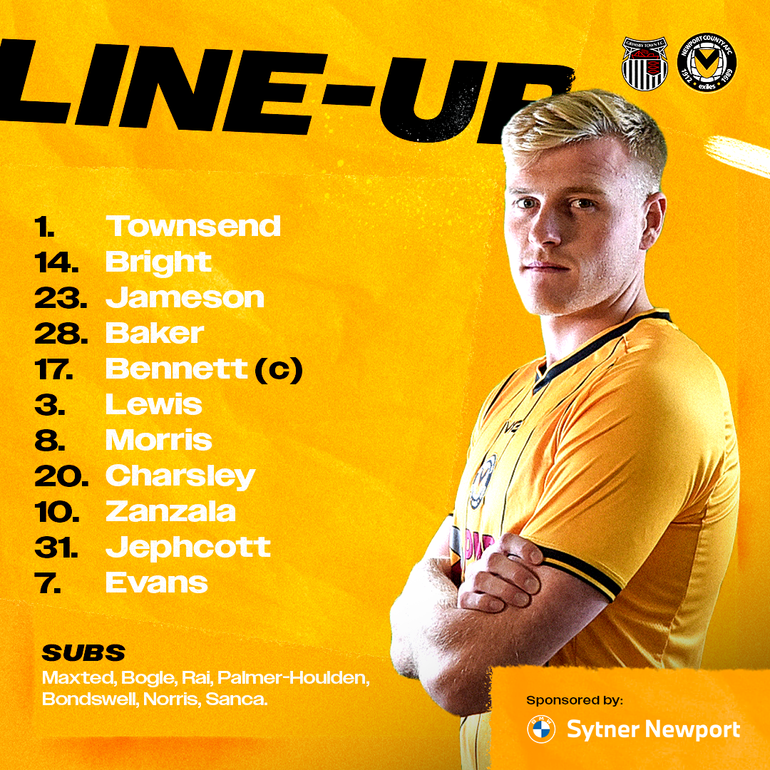 Newport County: Townsend, Bright, Jameson, Baker, Bennett (C), Lewis, Morris, Charsley, Zanzala, Jephcott, Evans.