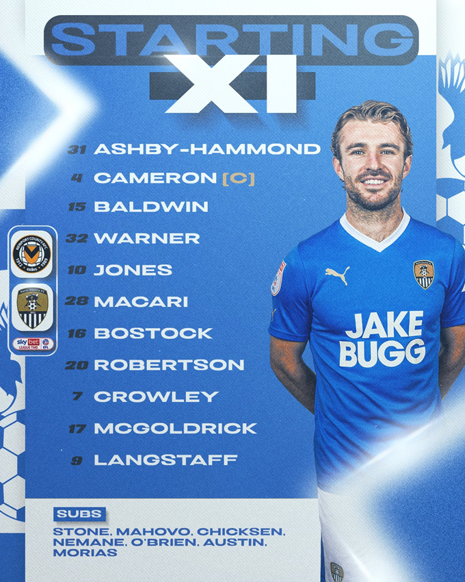 Notts County: Ashby-Hammond, Cameron (C), Crowley, Langstaff, Jones, Baldwin, Bostock, McGoldrick, Robertson, Macari, Warner.