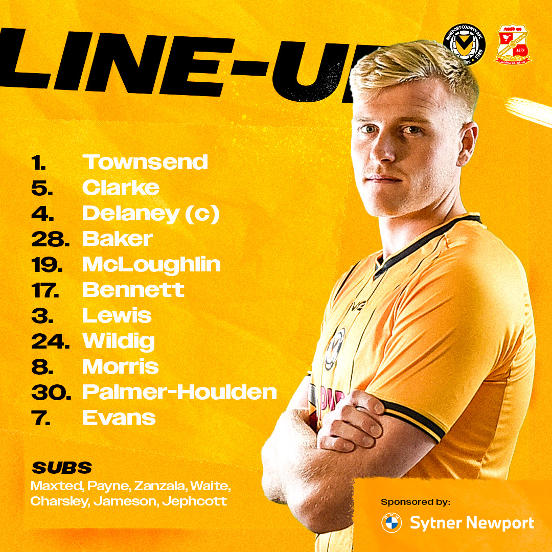 Newport County: Townsend, Delaney (C), Clarke, Baker, Lewis, McLoughlin, Bennett, Morris, Wildig, Evans, Palmer-Houlden.