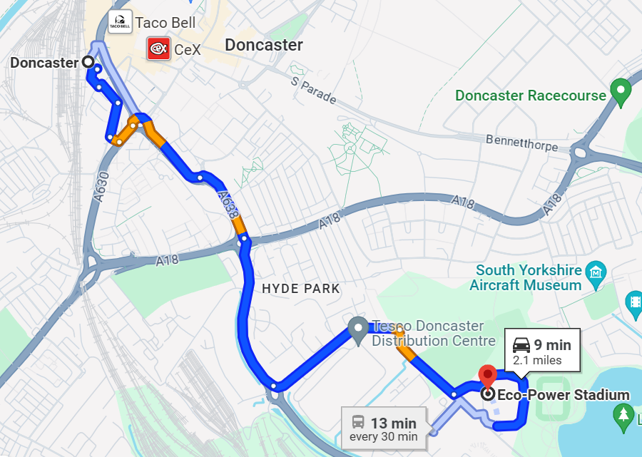 Doncaster station is around a mile and a half from the stadium. This is not going to be walkable for all fans, but if you do fancy a stroll, this will take between 30-40 minutes.