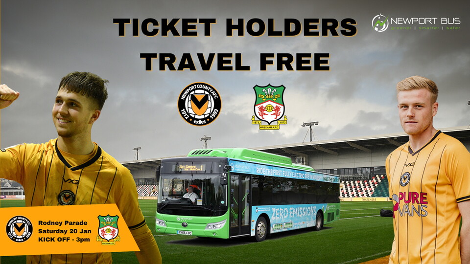 Newport County are proud to announce that club partners Newport Bus will offer free transport to and from the Newport County v Wrexham fixture on January 20. All home ticket holders are eligible to claim their free Newport Bus transport. Simply show the driver your match ticket or season ticket when boarding.