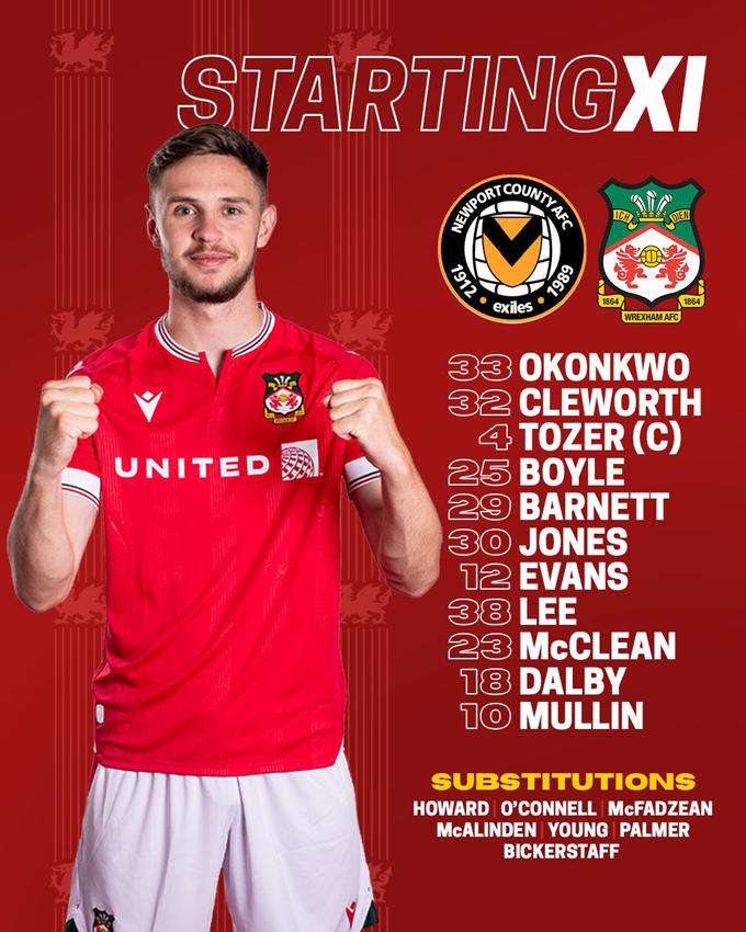 Wrexham: Okonkwo, Cleworth, Tozer (C), Boyle, Barnett, Jones, Evans, Lee, McLean, Dalby, Mullin.
