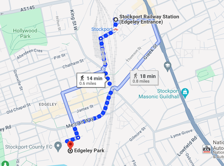 Getting to Edgeley Park from Stockport train station is simple. The stadium is around a 15-20 minute walk, depending on your pace. When you leave the station, walk west on Station Road before turning right towards Railway Road. You will then need to turn right onto Wellington Road before turning right again on Greek Street. When you come to the roundabout, take the second exit onto Merican Way and then turn left onto Worrall Street before one final turn right into Hardcastle Road, where you should see the stadium.