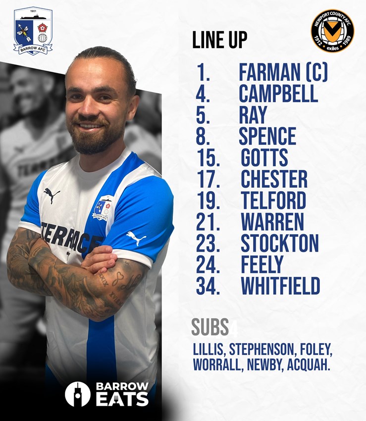 Barrow AFC: Farmer (GK), Campbell, Ray, Spence, Gotts, Chester, Telford, Warren, Stockton, Feely, Whitfield.