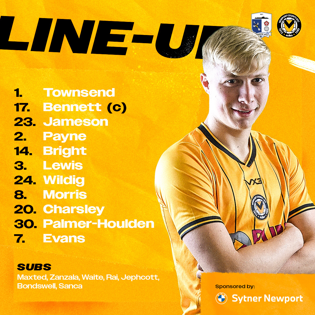 Newport County: Townsend, Jameson, Bennett (C), Bright, Lewis, Payne, Wildig, Morris, Charsley, Palmer-Houlden, Evans.
