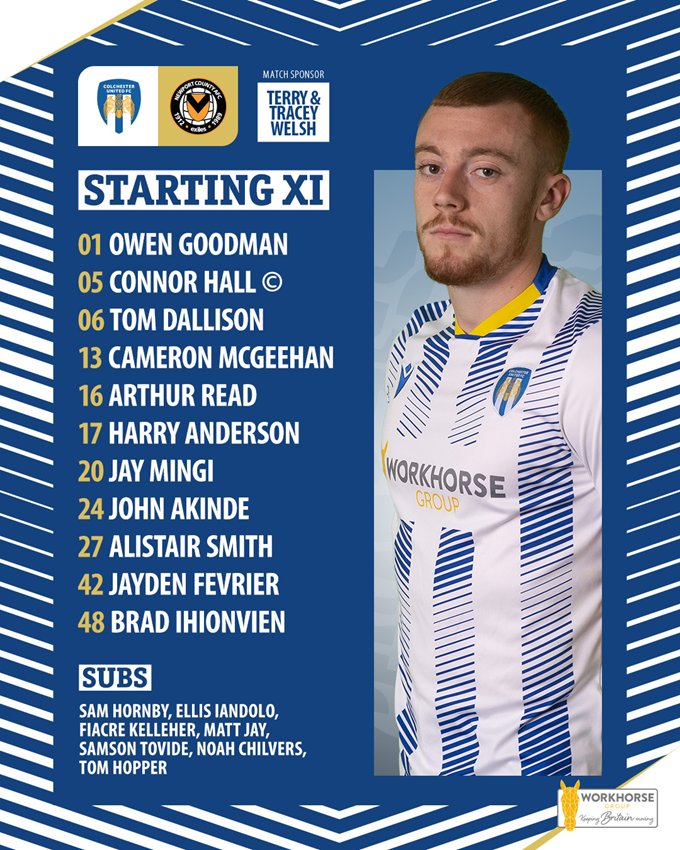 Colchester United: Goodman, Hall (C), Dallison, McGeehan, Read, Anderson, Mingi, Akinde, Smith, Fevrier, Ihionvien.